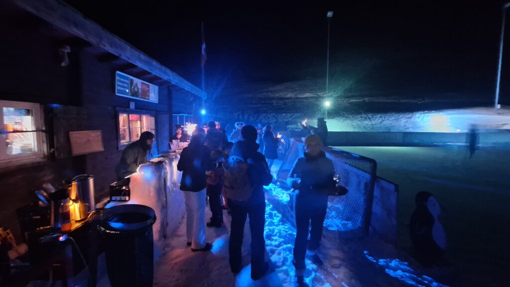 Am Silvesterabend verwöhnen wir euch mit leckeren Häppchen aus unserer Küche. Unsere Fusion-Interpretation von Tapas mit Köstlichkeiten aus verschiedenen Ländern weltweit bieten vom Apéro bis zum Dessert alles, was das Gourmetherz begehrt. So habt ihr genügend Zeit euch mit euren Liebsten bei gemütlichem Beisammensein auszutauschen und nebenbei her zu schmausen. Danach geht es ab auf die Eisfläche. Mit bunter Beleuchtung, fäziger Musik und einer Aussenbar sorgen wir für Partystimmung auf dem Natureisfeld und laden zum Tanz auf Schlittschuhen ein. Wir freuen uns, mit euch ins neue Jahr zu rutschen. Wortwörtlich!